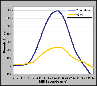 Our standard and corner baseplate casters absorb shock in a way that no other caster can - for free! As shown in the graph to the right, an Atlas 1000 Series caster absorbs about 2/3 more shock than a competing caster. Not only does this mean that your equipment will be better protected with Atlas, but the casters themselves can withstand far more abuse. The same can't be said for our competition, their bearings were ruined by the end of testing. This passive form of shock absorption comes naturally from taking advantage of the material properties of our stainless parts. When an annealed stainless is cold worked into the shape of our double drawn kingpin rivet or our tempered stainless moving parts are formed into their respective shapes, the metal becomes harder, much stronger, and the elastic modulus decreases. Effectively, our thin, lightweight parts become stainless steel springs that absorb shock though a combination of passive deflections and flexural elongations. The case-hardened low carbon steel used by our competitors exhibits none of this behavior, it is just thick, heavy, and clunky. |
